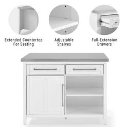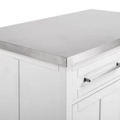 Add storage, workspace, and a dining area to your kitchen with the Silvia Kitchen Island. Classic recessed panels and oversized bar hardware make this island perfect for a variety of home styles. Add storage, workspace, and a dining area to your kitchen with the Silvia Kitchen Island. Classic recessed panels and oversized bar hardware make this island perfect for a variety of home styles. With full-extension drawers, a large cabinet, and open shelving, all your kitchen items will stay neat and tidy. The oversized countertop extends past the island base creating dining space for a casual evening meal.Features:Traditional designBuilt-up stainless steel countertopWhite finishGenuine metal bar hardware with a brushed nickel finishShaker-style recessed panels on cabinet door and drawer frontsCabinet door has a magnetic closureTwo adjustable and removable shelves, each with a 15lb weight limitTwo full-extension drawers on ball-bearing glides, each with a 15lb weight limitLarge countertop extends 10″ past the base adding space for seatingTapered legsCountertop weight limit is 100lbsPairs well with modern and farmhouse decor
