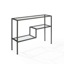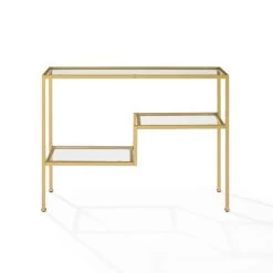 The Sloane Console Table combines modern elegance with Art Deco flair. Constructed with a sculptural steel frame and sturdy tempered glass shelves, this table is perfect for displaying your favorite decor or books. The variable shelf heights and gold finish of the frame create a geometric design that adds sophistication to your living room or entryway.
