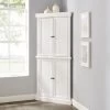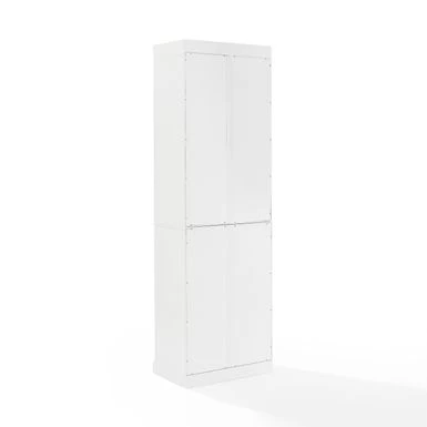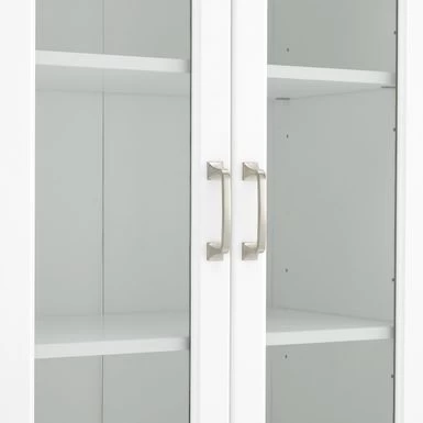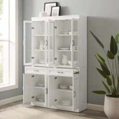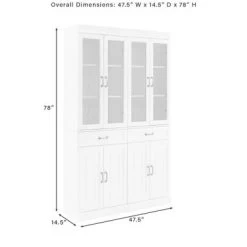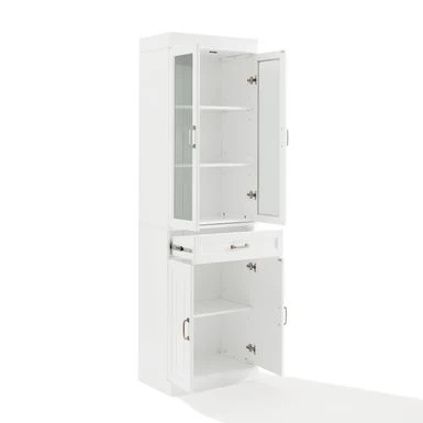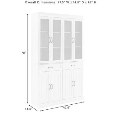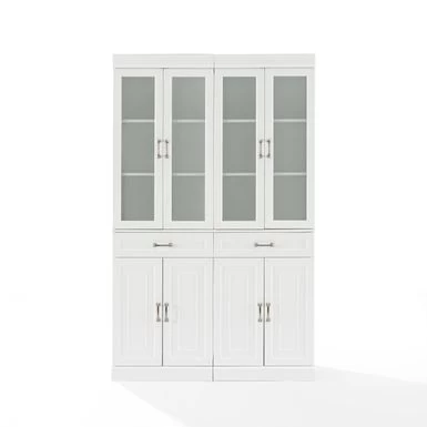 Create the look of a classic built-in china cabinet and buffet with the Stanton 2pc Glass Door Pantry Set. Create the look of a classic built-in china cabinet and buffet with the Stanton 2pc Glass Door Pantry Set. Each tall pantry features upper cabinets with tempered glass doors for displaying your best dishware or keepsakes, plus adjustable shelving for flexibility. The lower cabinets of each pantry also offer adjustable shelving that is concealed by panel doors. Both pantries have a full-extension storage drawer for smaller items. Keep any room in your home organized with the Stanton 2pc Glass Door Pantry Set.Features:Traditional designWhite finishGenuine metal hardware in a brushed nickel finishEach pantry has two large cabinets with double doors, magnetic closures, and concealed hingesBoth upper cabinets have two adjustable and removable shelves each with a 15lb weight limitBoth lower cabinets have an adjustable and removable shelf each with a 15lb weight limitEach pantry has a full-extension storage drawer on ball-bearing glides with a 15lb weight limitRecessed paneling on cabinet doors and drawer frontsAll pieces are modular to maximize space and flexibilityPairs well with modern farmhouse decorUpper cabinets have tempered glass doors