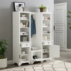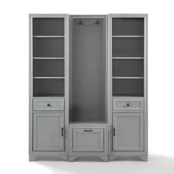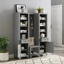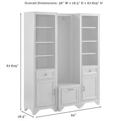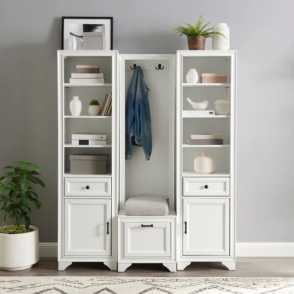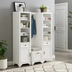 Maximize your entryway’s organization and style with the Tara 3Pc Entryway Set. This set includes two tall cabinets and a hall tree, providing ample storage for daily and seasonal items. Each tall cabinet features three adjustable open shelves, a full-extension drawer, and a lower cabinet with an adjustable shelf. The hall tree comes with two double prong hooks plus a storage compartment with a hinged door and magnetic closure. The transitional design complements traditional and modern farmhouse décor, and the genuine metal hardware in distressed brass finish adds charm to your home. Customize your storage with small storage baskets and decorative items, and enjoy the flexibility of modular pieces that maximize space.