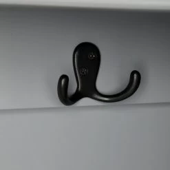 - Hall tree with double prong hooks and storage compartment with hinged door and magnetic closure