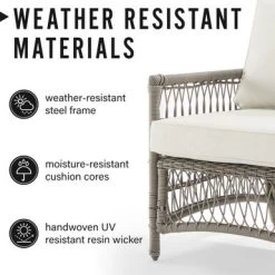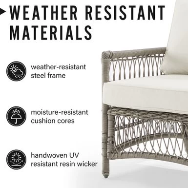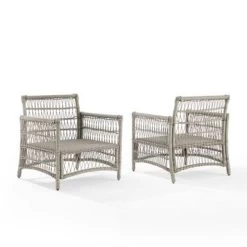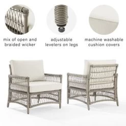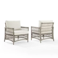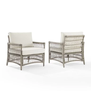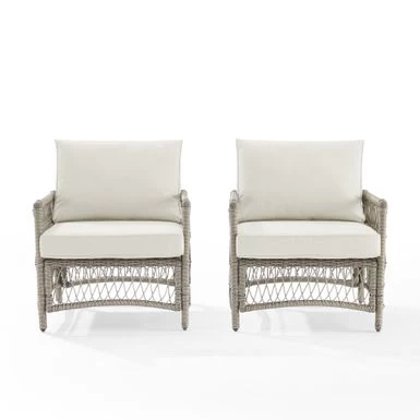 Refresh the look of your outdoor space with the Thatcher 2Pc Outdoor Wicker Armchair Set. This set features modern coastal design with sturdy steel frames wrapped in UV resistant all-weather round resin wicker. The chairs offer deep seating and plush, weather-resistant cushion covers for added comfort. The simple silhouette of these armchairs blends with a variety of designs, while the mix of open and braided wicker adds a unique quality to any outdoor space.