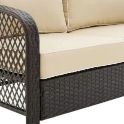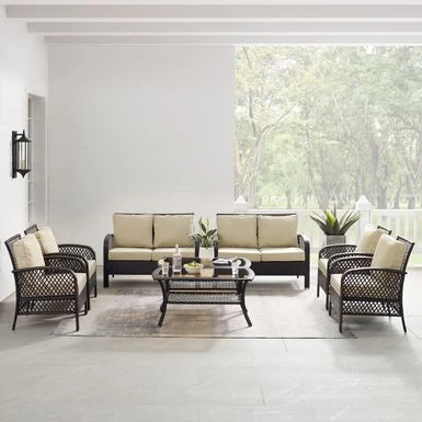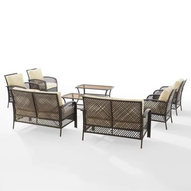 Gather friends and family for a day of relaxation with this 8-piece conversation set. With a unique lattice design, the loveseats, chairs, and coffee tables feature all-weather resin wicker over powder-coated steel frames. The seat cushions are covered in moisture-resistant dyed yarn polyester, while the glass tabletop coffee tables provide ample space for drinks and snacks.Â